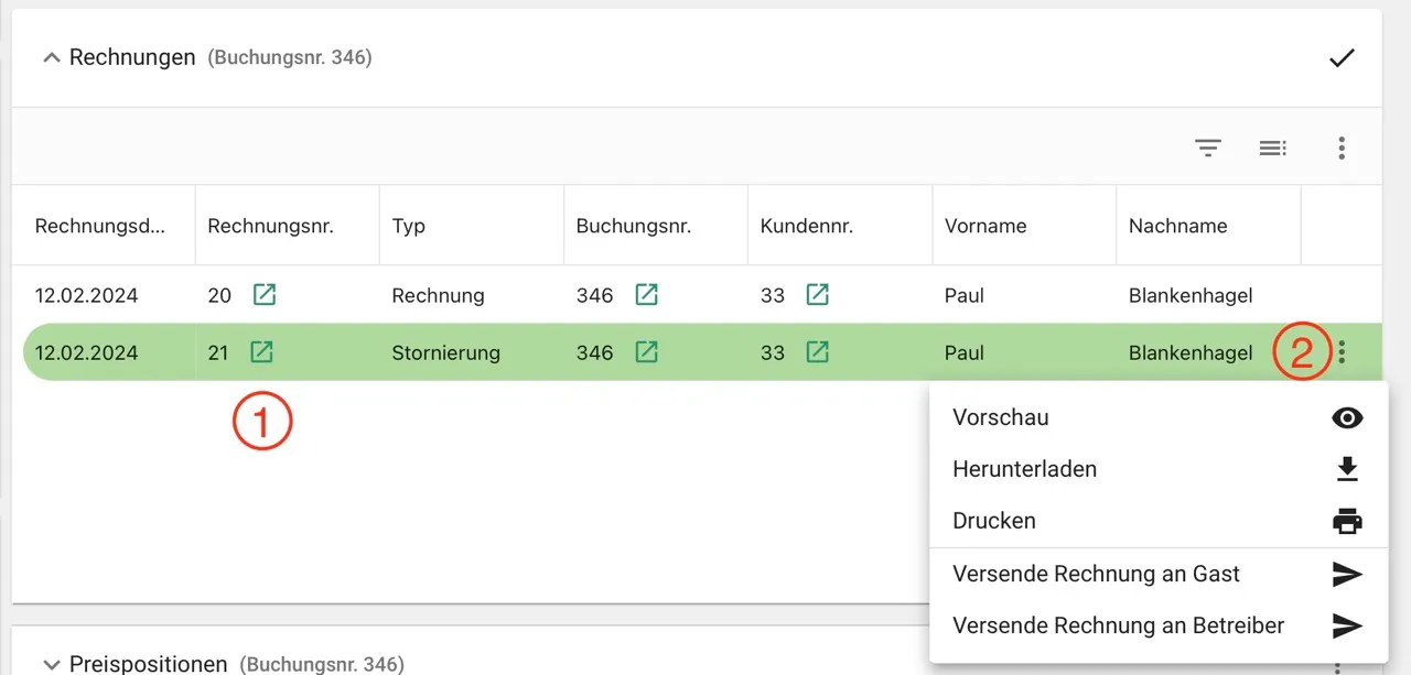 Nach erfolgter Rechnungsstellung, kann jede Rechnung nach Auswahl (1) und einem Klick auf die drei Punkte (2) heruntergeladen, gedruckt oder per Klick als Mail versendet werden.