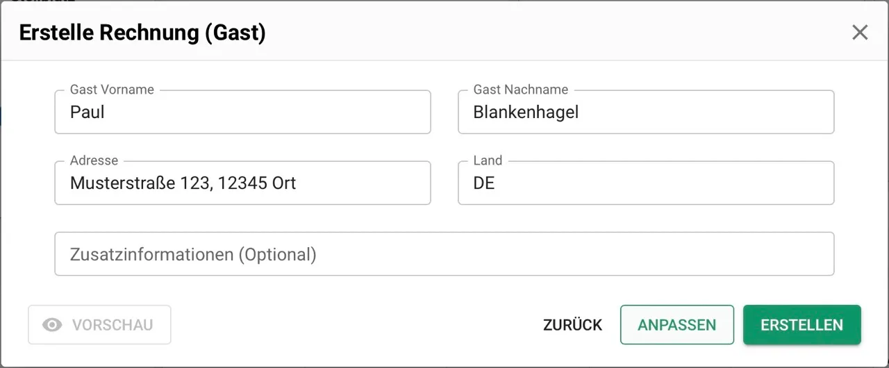 Wenn du wieder ANPASSEN ausgewählt hast, kannst du nun den Namen oder die Adresse des Gastes beliebig anpassen. Es kann Szenarien geben, da möchte der Gast eine andere Rechnungsadresse oder eine Firmenadresse angeben. Trage dann hier die Änderungen ein.