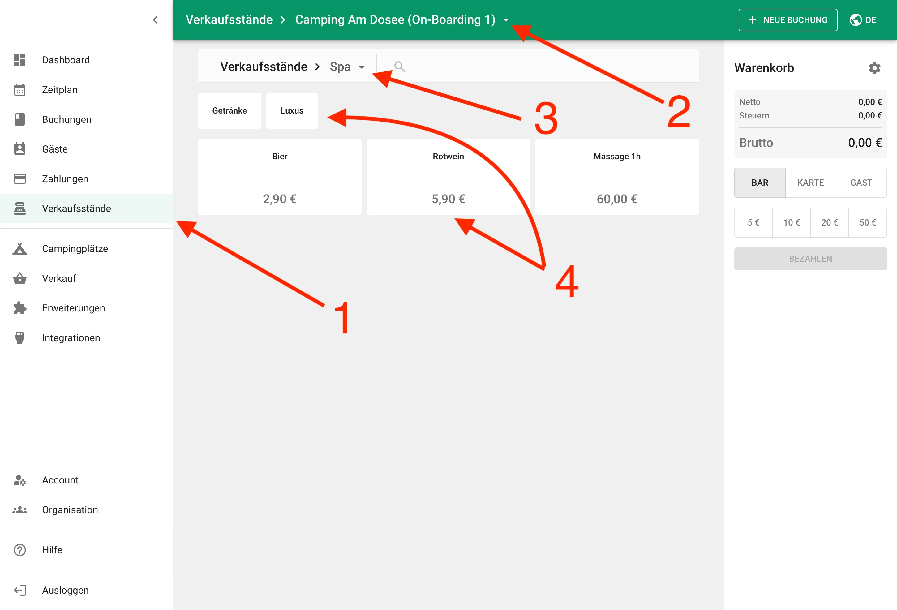 Du kannst die Konfiguration deines Verkaufsständes direkt ausprobieren. Gehe über die Sidebar zum Menüpunkt Verkaufsstände (1) und wähle den passenden Campingplatz aus (2) (sofern du mehrere Einheiten verwaltest). Wähle nun den dir passenden Verkaufsstand (3) aus. Nun werden nur Produkte und Produktgruppen des ausgewählten Verkaufsstandes angezeigt (4), sofern vorher explizit eine Zuweisung erfolgte. Hast du im vorherigen Abschnitt nichts zugewiesen, werden alle angelegten Produkte und Produktgruppen angezeigt.